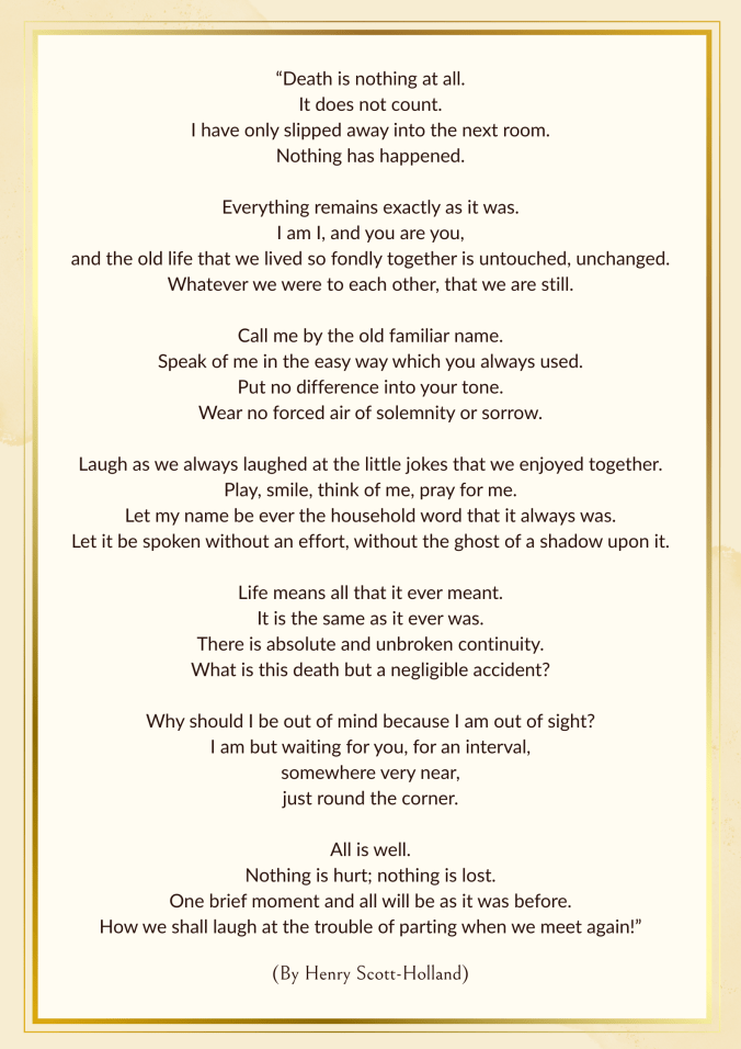 Há textos que atravessam gerações porque tocam, com simplicidade e profundidade, a dor da despedida. Entre eles, “A morte não é nada – Death is Nothing at all” tornou‑se um dos poemas mais compartilhados quando buscamos consolo após a perda de alguém que amamos. Mas, apesar de circular amplamente como se fosse de Santo Agostinho, essa atribuição é equivocada. O texto não pertence ao santo, nem ao período em que viveu. A versão moderna que conhecemos deriva de um sermão do século XIX, escrito pelo sacerdote anglicano Henry Scott Holland. Neste post, além de partilhar essa reflexão tão bela sobre continuidade e afeto, também recupero sua verdadeira origem — porque honrar a palavra também é uma forma de honrar a memória.
