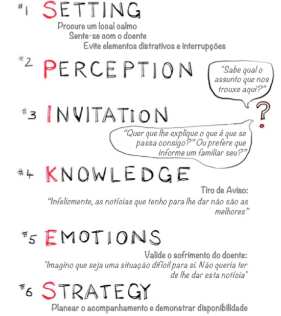 Para auxiliar no treinamento adequado dos profissionais alguns protocolos podem ser de grande valia, como por exemplo, o SPIKES. Este é composto por uma estrutura de 6 passos: Setting, Perception, Invitation, Knowledge, Emotions, Strategy/Summary. O SPIKES consiste em recolher informação do doente (Setting, Perception), transmitir informação acessível (Invitation, Knowledge), oferecer apoio e lidar com emoções (Emotions), e estabelecer um contrato com o doente obtendo a sua colaboração na elaboração de um plano (Strategy / Summary). Deste modo, o médico inicia a entrevista com perguntas abertas, procurando identificar e compreender as expectativas do paciente. Com o desenrolar da entrevista, assume uma postura mais diretiva (mas não paternalista!), recorre a perguntas cada vez mais fechadas de modo a clarificar as expectativas do paciente, aproximando-as da realidade da notícia a ser transmitida. Após comunicar a má notícia, o médico deve dar espaço e auxiliar o doente a lidar com as emoções. Só depois, surge a possibilidade de discussão de um plano que implica a partilha de decisões numa relação colaborativa entre o médico, o paciente e a família (Ferreira; Araújo; Madeira, 2018).