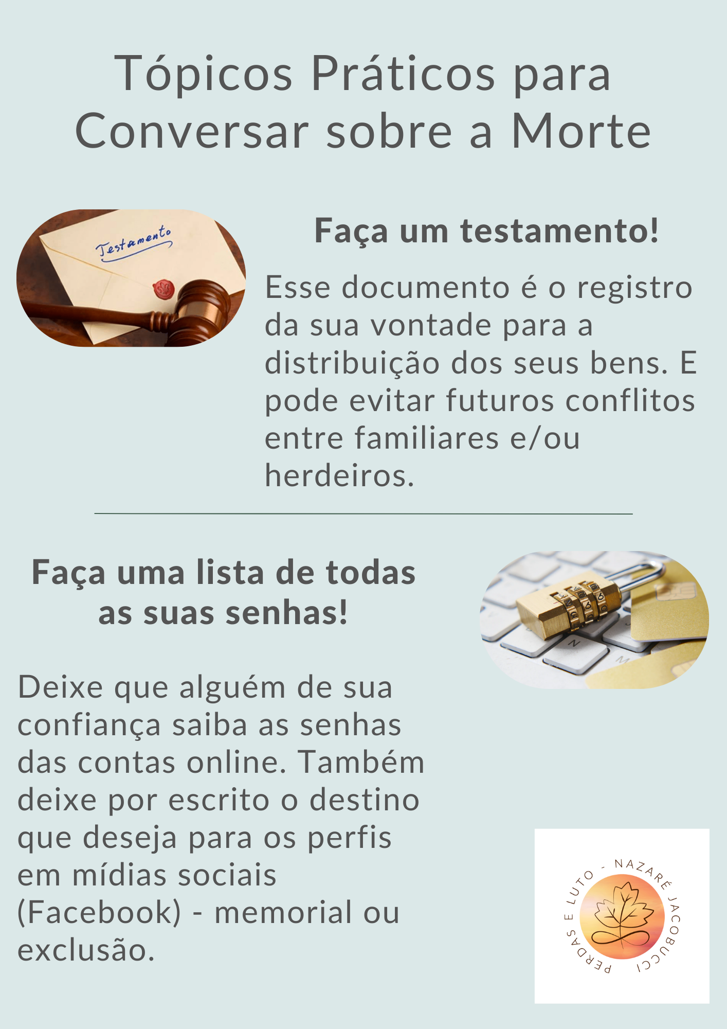 A organização desses tópicos é um ponto de extrema importância no processo de luto dos familiares, pois quando os herdeiros sabem o que fazer, conhecem o desejo manifestado do seu ente querido, e sabem as senhas de acesso, isso pode contribuir para a regulação do estresse e da ansiedade durante o processo de luto. Com efeito, além do impacto prático no dia a dia e no acesso a diversos recursos, inclusive financeiros, não saber as senhas de acesso pode gerar um elevado grau de ansiedade nas pessoas enlutadas e tornar o período de luto ainda mais traumático.